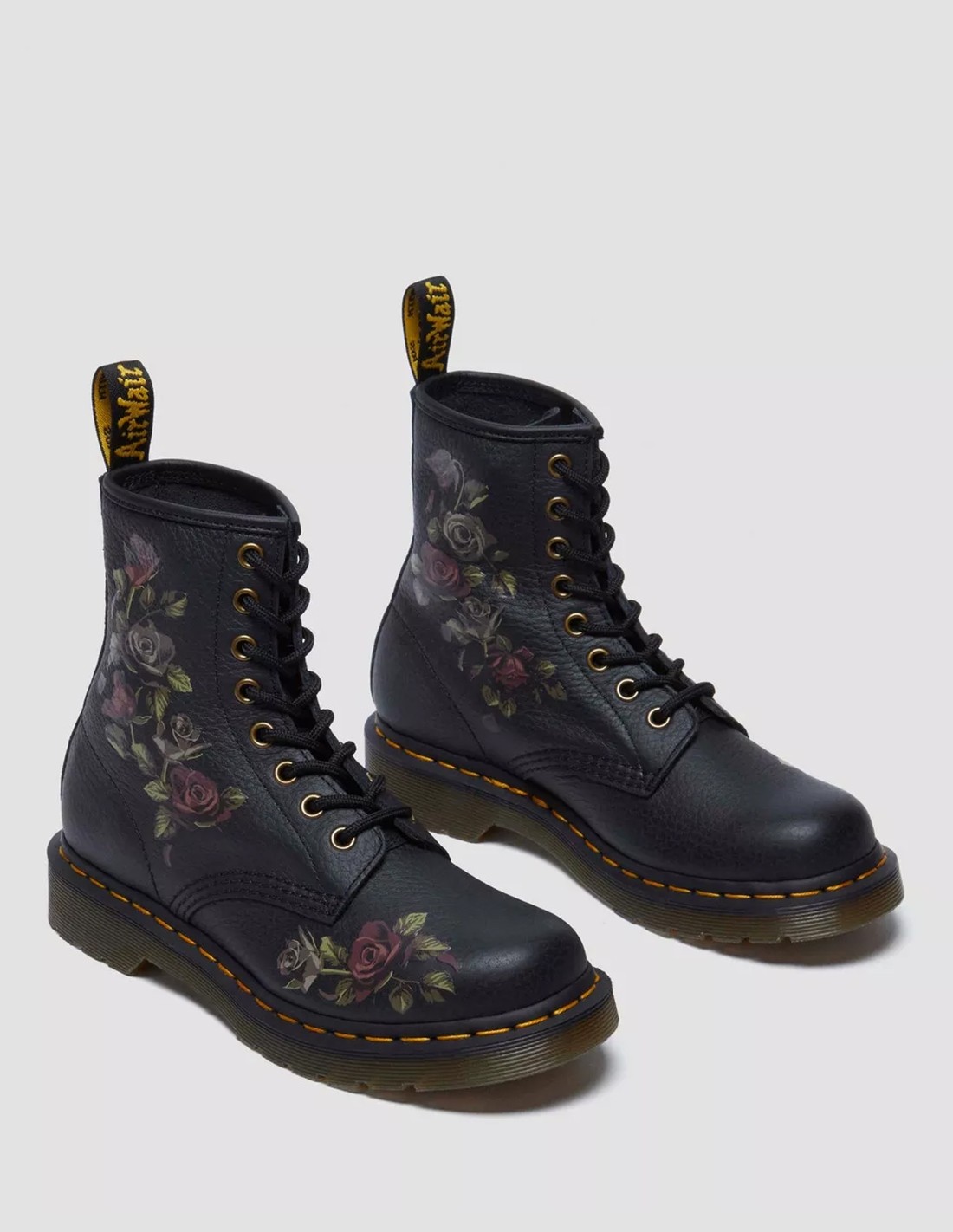 La surpiqure jaune, véritable identité de la marque est présente, ainsi que sa languette AirWair au talon.