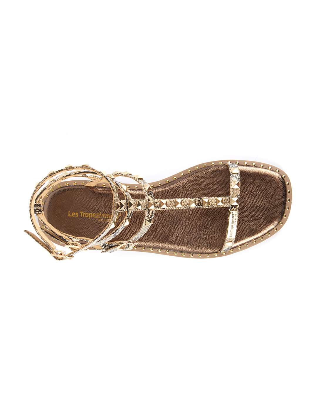 Sandales femme CORALIE Cognac, recouvertes de clous pyramidaux dorés sur tige en cuir.